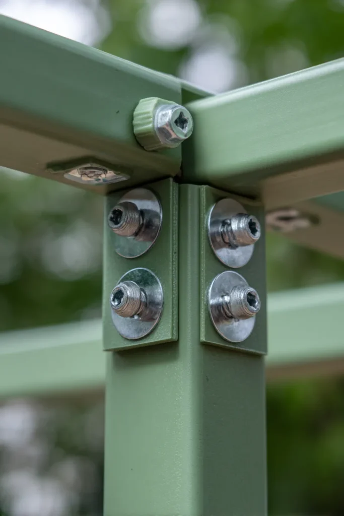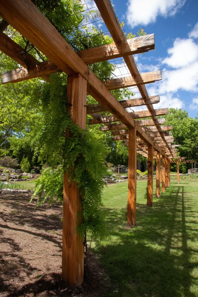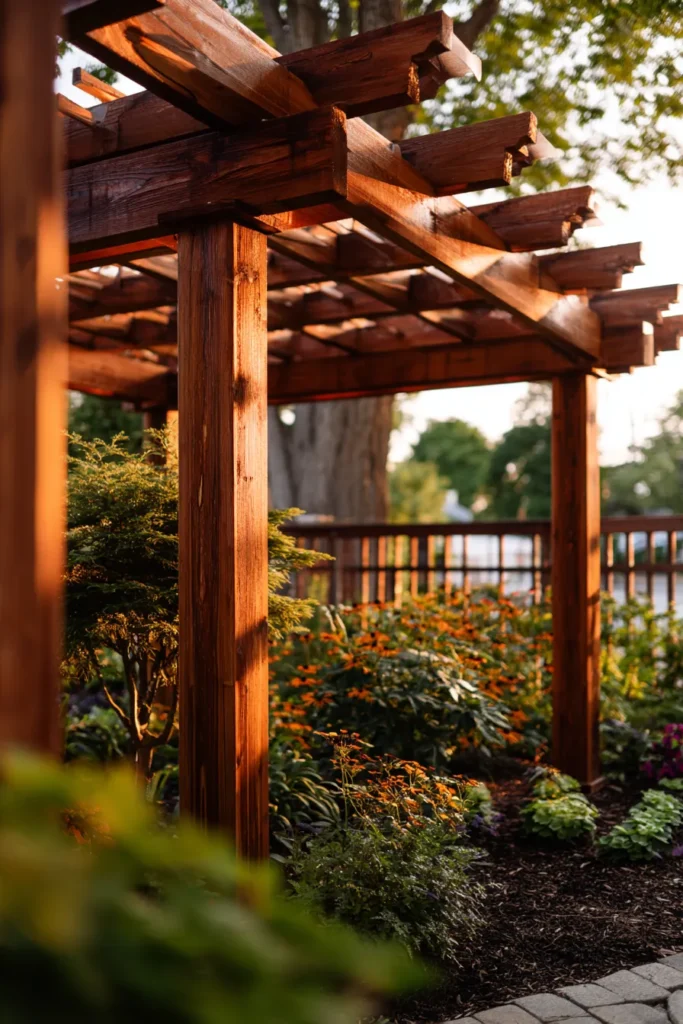 I truly think this look is so charming because it feels perfectly at home in a garden setting, like it was built just for climbing roses and wisteria, seriously. The simple, rough-hewn texture of the wood is just so warm and inviting, and I think the exposed hardware and notched beams are such a cute, easy detail that adds a lot of character. If you’re into a rustic or cottage look, a simple natural wood pergola built with easy, visible joints like this is a fantastic and very achievable weekend project for a garden path or entryway.