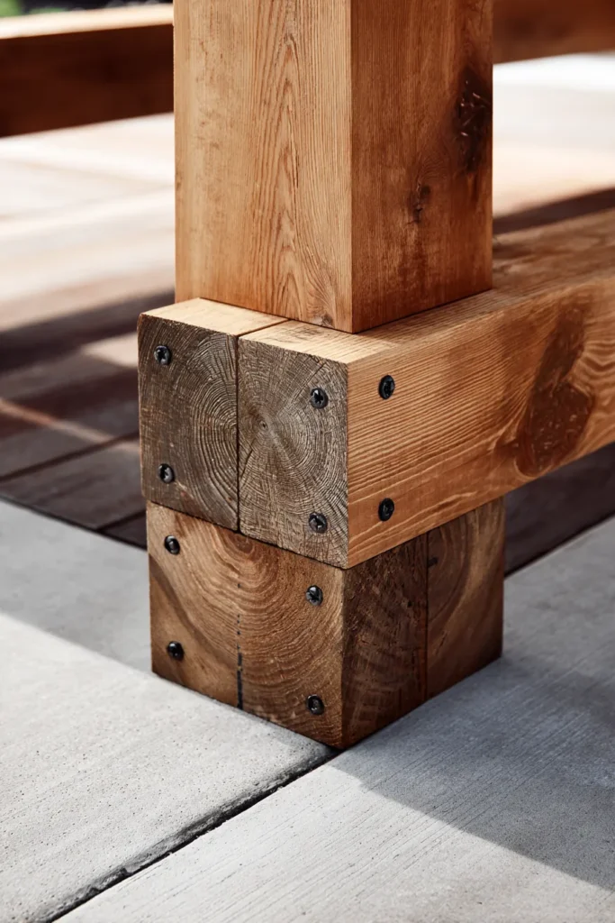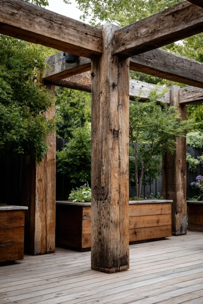 I am absolutely in love with the sheer presence of those huge, rough-hewn wood posts because they create such a stunning, almost sculptural statement in the yard, honestly. The contrast between the light deck boards and the dark, richly textured timber is incredibly chic and gives the whole space such a luxurious, grounded vibe. If you’re into a rustic or industrial look, building a simple, sturdy pergola with these kinds of bold, chunky beams is the perfect way to anchor your outdoor living space and make it feel totally custom.