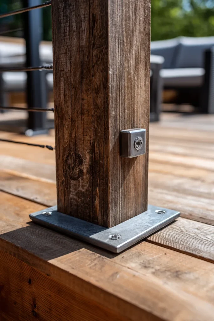 I really love how intentional the design details are here because even the post connection is a total style statement, honestly. The combination of that rustic, weathered wood post with the sleek, industrial metal hardware and cable railing is so chic and gives me total modern-industrial cabin envy. If you’re looking for a simple pergola that matches this look, one built with distressed wood and secured with visible metal brackets would be the perfect way to define the space and keep that clean, contemporary feel.