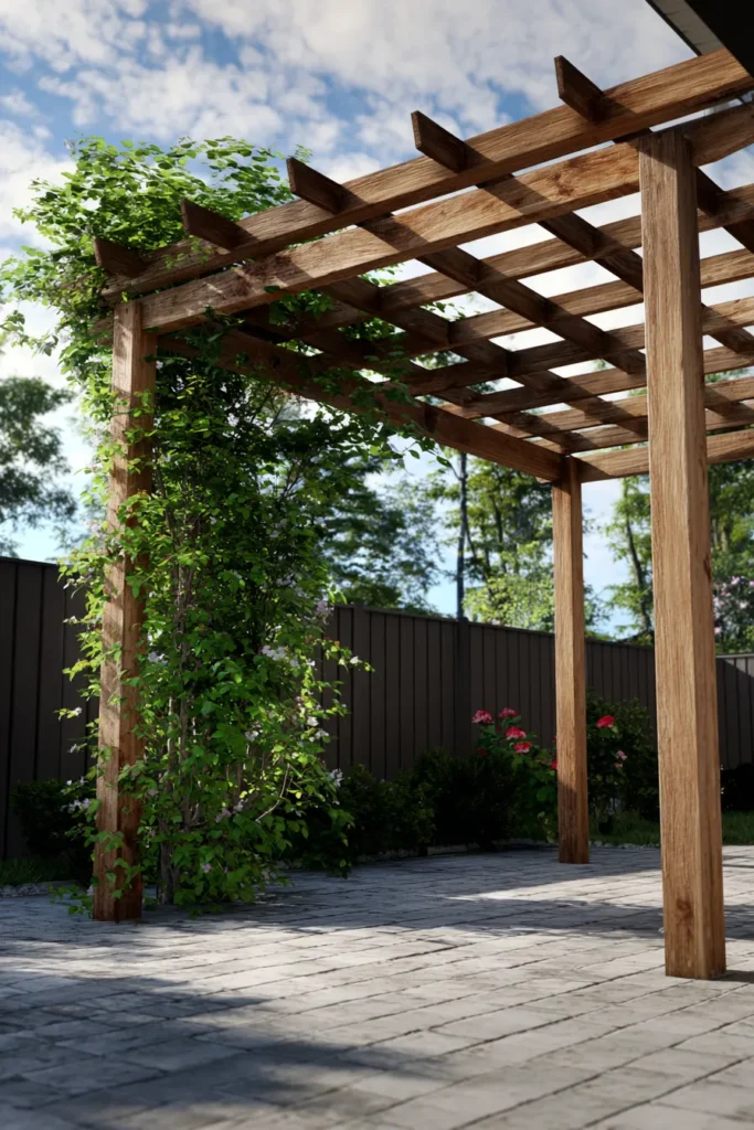 This outdoor area shows a gorgeous blend of natural wood structure and lush greenery, making the patio feel like a true extension of the garden. The space features a large, square patio paved with muted gray pavers, which provides a clean, neutral base. A simple, freestanding pergola built from smooth, medium-toned natural wood stands tall over the patio, with one corner beautifully covered by climbing vines and foliage, offering that perfect mix of dappled shade and organic texture.