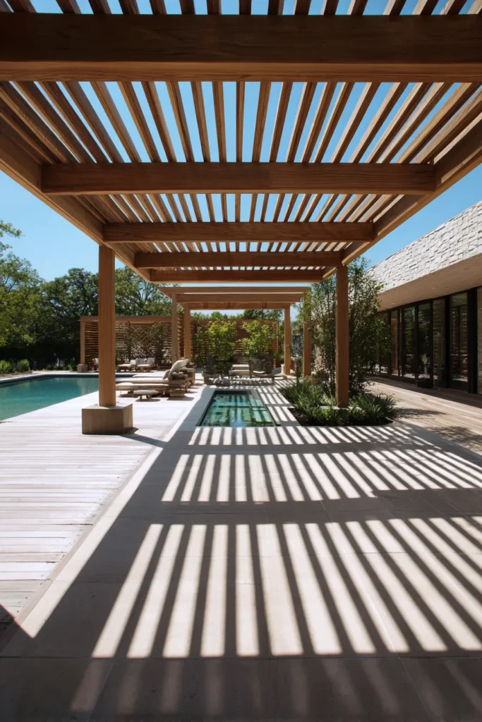 I truly think this entire setup is just total vacation goals because it feels like a five-star hotel right in your own backyard, seriously. The way the slatted pergolas define the different areas—lounging, a shallow water feature, and walkways—is so incredibly smart and chic, and I just adore those dramatic shadow lines. If you’re into a clean, architectural look, a simple slatted pergola like this one, built with beautiful, smooth wood, is the perfect, easy way to add instant style and definition to any large patio space.