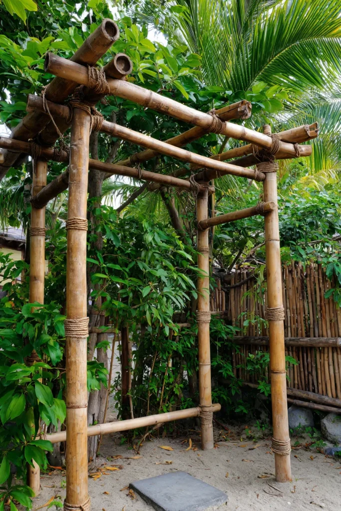 I think this look is just the coolest because it instantly transports you to a vacation state of mind, seriously! The use of natural bamboo, held together simply with rope, is so clever and gives the whole area such an authentic, bohemian vibe that I totally adore. If you’re looking for a super simple, inexpensive, and unique DIY pergola idea for a garden entrance or small meditation spot, building one with bamboo like this is the perfect way to add playful structure and major style without needing any complicated tools.