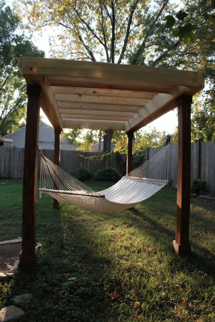 This backyard setup is all about creating a super functional and inviting space for ultimate relaxation right at home. The design features a simple, freestanding pergola built over a grassy patch, perfectly defining a little retreat area. It utilizes a lovely contrast of materials with dark-stained, sturdy wood posts and a lighter, natural wood roof structure, and the whole thing is centered around a gorgeous rope hammock that looks incredibly inviting.