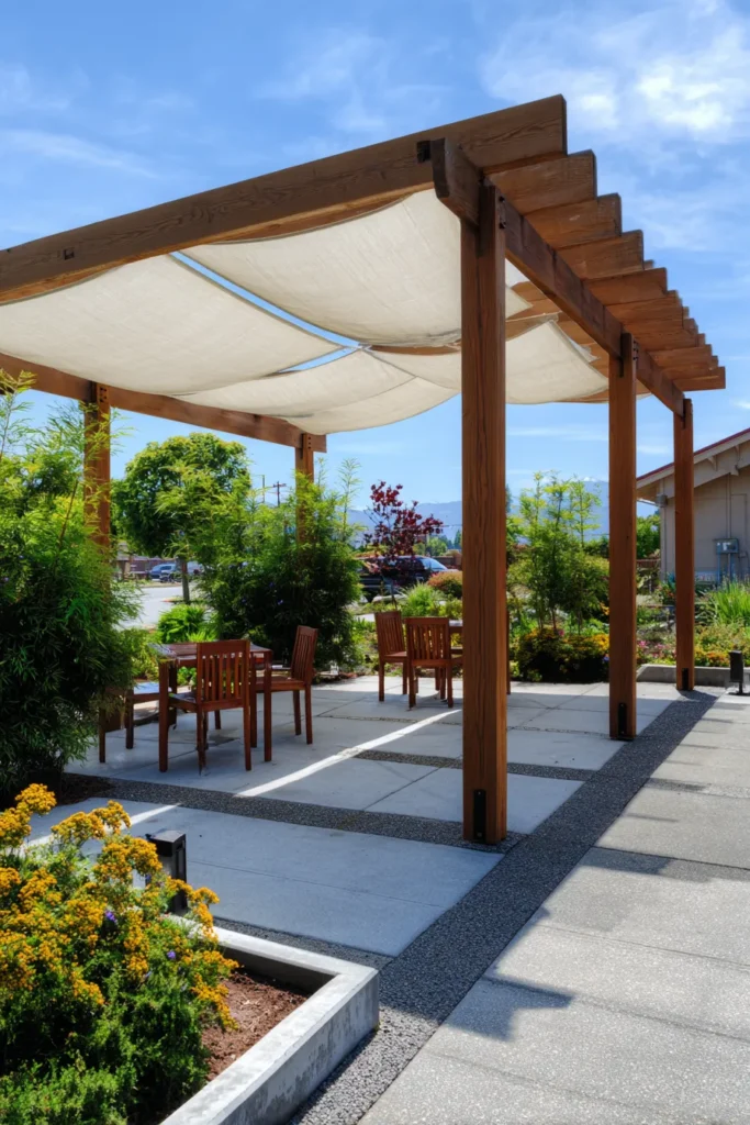 I think this design is just brilliant because it proves that you can have style and serious functionality, which is so important for sunny areas, honestly. That gorgeous mix of the warm wood, cool concrete, and soft white fabric is incredibly chic and gives me total modern Mediterranean vibes. If you’re into outdoor dining and want more than just dappled light, building a simple wood pergola and adding a fabric shade system like this is the perfect, easy way to create a gorgeous and usable outdoor room.