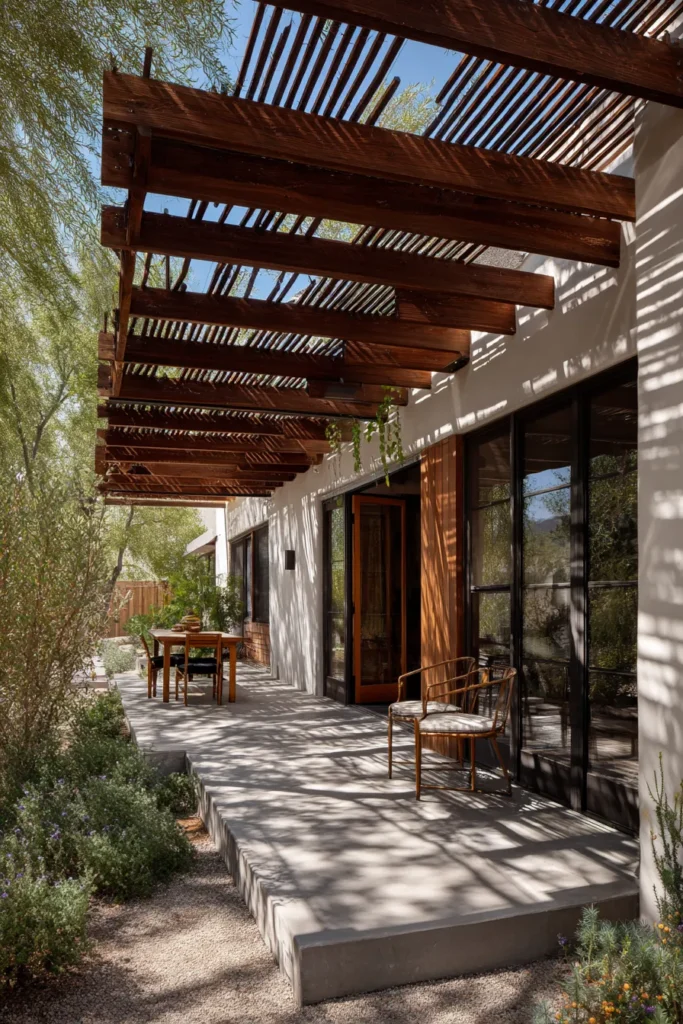 I am totally obsessed with how seamless and chic this whole patio setup is because it makes the outside feel like a natural extension of the living room, honestly. That stunning contrast between the clean white walls and the rich, dark-stained wood slats of the pergola is incredibly luxurious and modern. If you’re into entertaining and want to create a visually striking space with gorgeous shadow play, a simple slatted pergola like this, built right off the side of your house, is the ultimate way to achieve that resort-quality look.