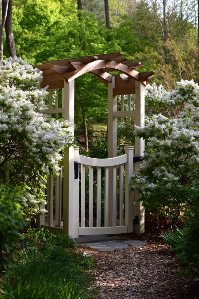 This lovely setting is giving me total secret garden vibes, perfectly blending traditional structure with abundant natural beauty. The space is framed by lush, white-flowering shrubs and deep green foliage, leading to a charming white picket gate and a gentle archway. The archway features bright white painted posts that support a simple, slightly curved roof structure made of natural or light-stained wood, creating a beautiful transition into the woods beyond.