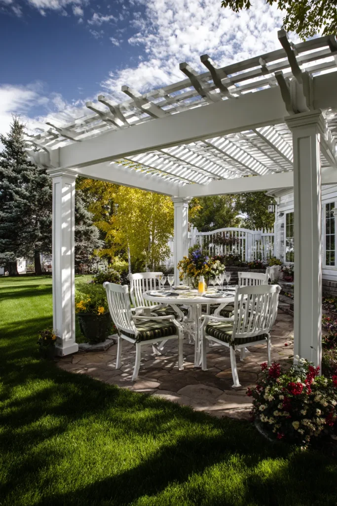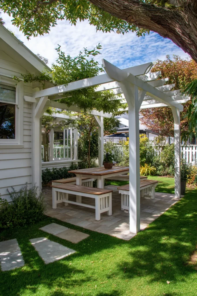 I think this whole setup is just perfection because it’s the ultimate inspiration for turning a boring side yard into a gorgeous entertaining area, seriously. That all-white attached pergola is so crisp and clean, and the little touch of green vines starting to grow over the top is adding just the right amount of organic texture. If you’re into hosting, a simple, bright white pergola like this is the perfect, easy way to define your outdoor dining room and make the entire backyard feel incredibly chic and inviting.