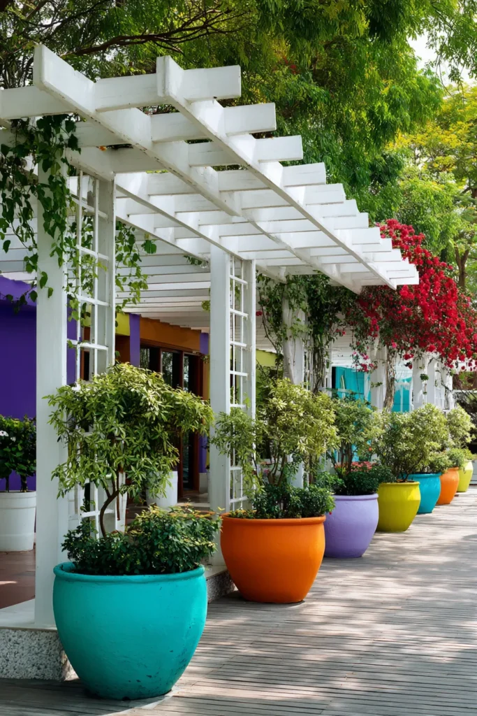 This vibrant outdoor area is a celebration of color and playful design, giving off serious tropical or playful arts district vibes. The background features buildings painted in bold, fun colors like deep purple, bright yellow, and blue, making a huge visual impact. The space is grounded by a light-colored wood deck and defined by a long, bright white pergola that is partially covered in climbing vines, complemented by a gorgeous row of oversized planters in every color of the rainbow.