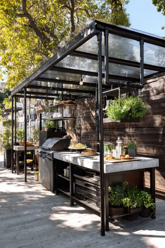 I honestly think this entire setup is just the coolest because it takes a functional kitchen and makes it look like a high-end, bespoke industrial lounge, seriously. That combination of the dark metal framing, the exposed pipes, and the natural wood is so chic and gives me total modern urban loft vibes. If you’re into cooking outdoors and want serious style, a simple metal-frame pergola like this with a clear roof is the easiest way to get an all-weather kitchen that will totally impress your guests.