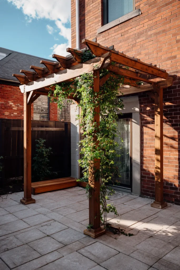 Honestly, this design just proves that less is truly more when it comes to backyard structures. I’m obsessed with how the climbing plants make it feel like an enchanted secret garden even though it’s right up against a city home. That perfect pop of green against the warm wood is just so inviting and chic. It’s not too big or overly complicated, so you know it’s a project you could realistically tackle, and the payoff is a stunning outdoor room that’s perfect for your morning coffee or evening glass of wine.