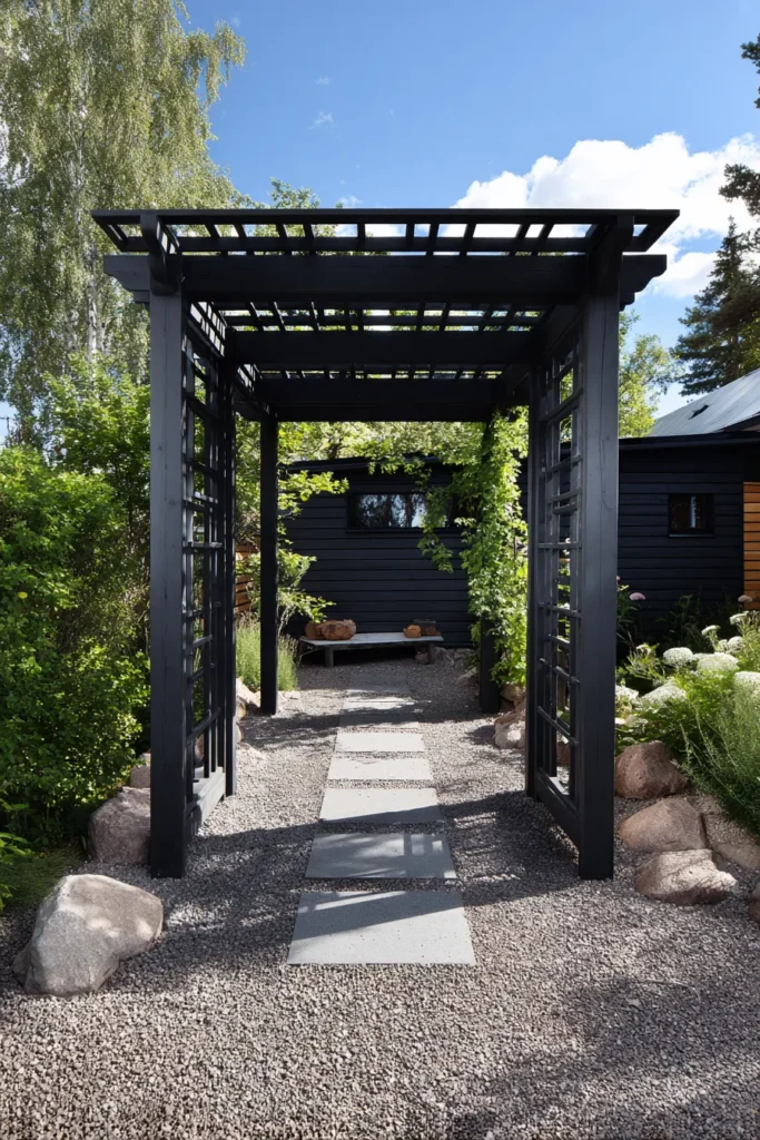 I’m completely obsessed with how this little structure proves that even a shed can be a total design statement, honestly. The combination of that crisp black and the warm wood is just so visually satisfying and feels incredibly stylish, like something straight out of a European design magazine. A simple, dark-stained pergola built right against this building would be perfect for supporting climbing roses or vines, turning the whole area into the most relaxing little outdoor living room.