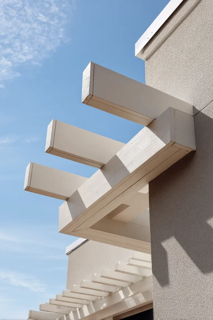 I am seriously obsessed with how effortlessly chic this stucco exterior is because it just screams high-end minimalist design, you know. That gorgeous, sandy color is the perfect neutral backdrop for any outdoor decor and makes everything look instantly sun-drenched and expensive. A simple, attached pergola like the one shown in the photo, with those striking white cantilevered beams, is the ultimate way to add architectural interest and a little bit of needed shade to a patio space without making the whole look feel too heavy.