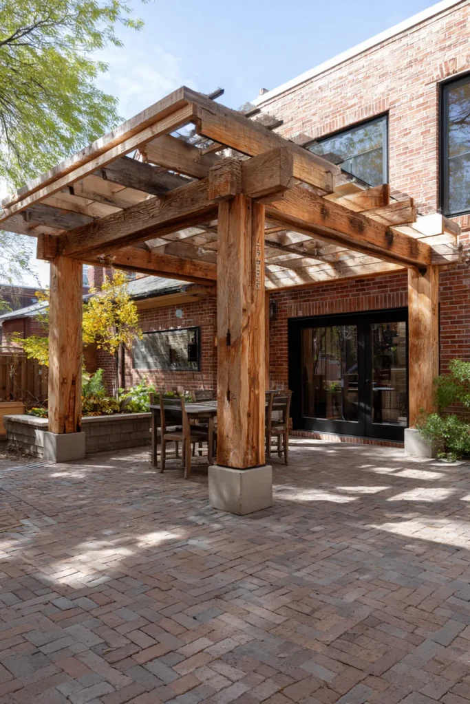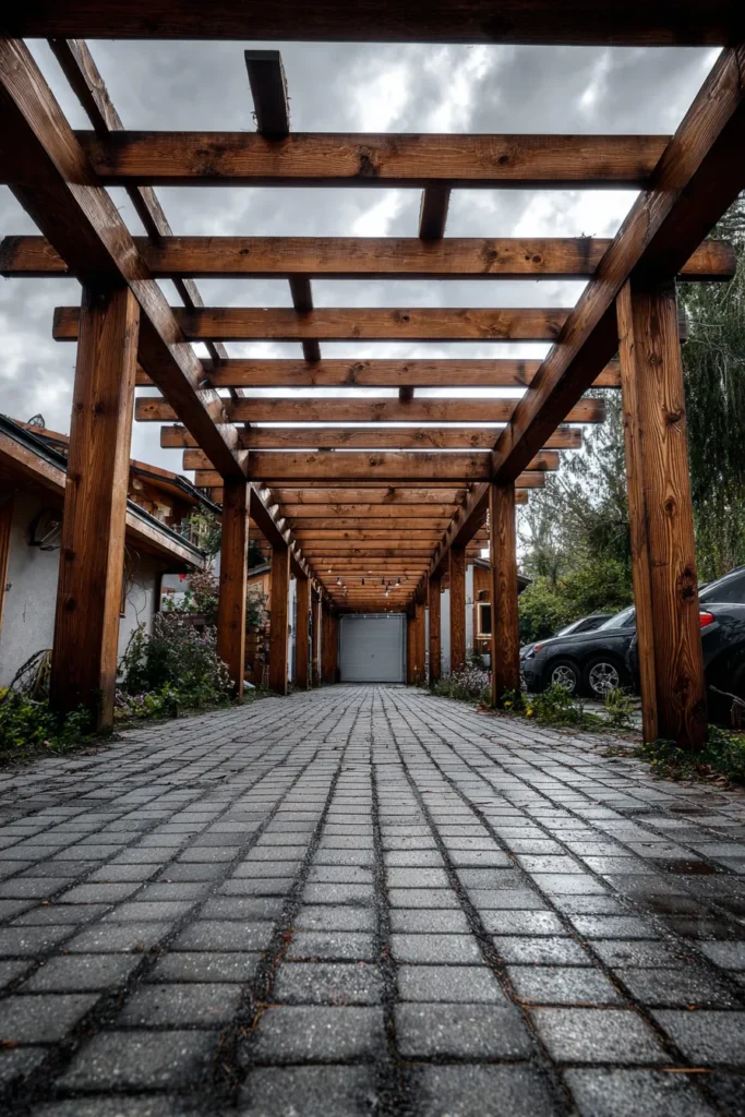 I honestly think this whole setup is so clever because it transforms what could just be a functional driveway into a really grand, inviting space. That long row of thick, rustic wood beams gives the whole area so much drama and texture, and I just love how the dark wood contrasts with the light walls. If you’re into outdoor dining or just want a structured entryway that offers shade, a simple, long pergola like this one built over a brick or paver patio is absolutely the way to go.