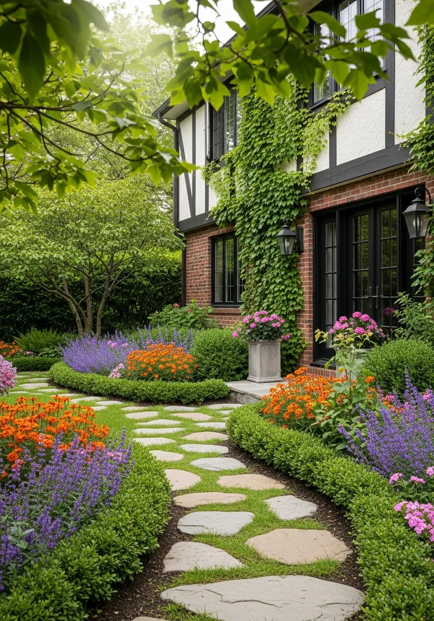 This dreamy front yard is a floral paradise. A charming stepping-stone path, bordered by perfectly manicured greenery, winds through an explosion of color—vibrant orange blooms, soft lavender hues, and pops of wildflowers create a painterly effect. Ivy gracefully climbs the brick facade of this enchanting Tudor-style home, while black-framed French doors add a touch of old-world elegance.
