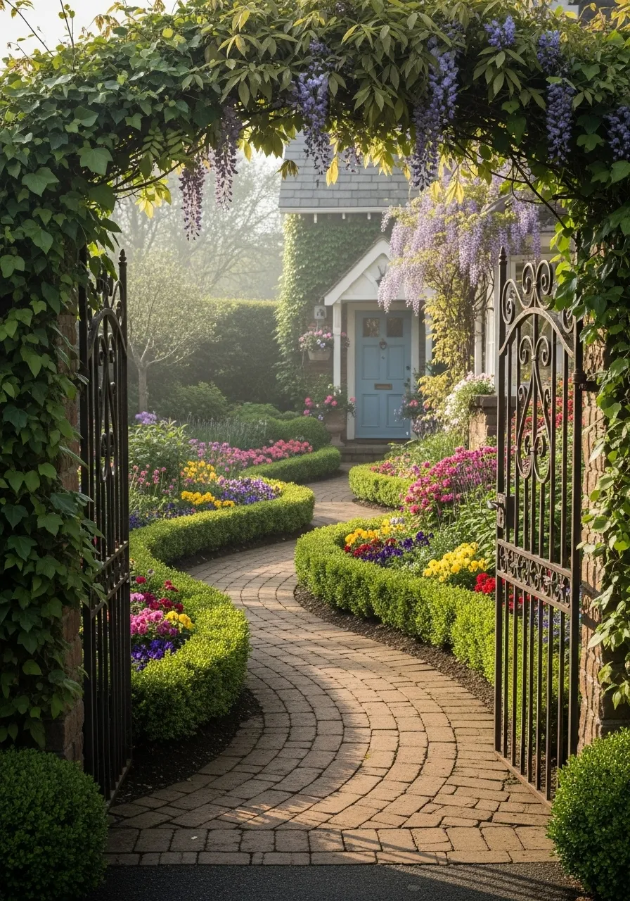 This front yard is pure enchantment! A charming brick pathway, lined with neatly trimmed hedges and bursting flower beds, leads to the most whimsical cottage with a soft blue door and ivy-draped eaves. The lush greenery and cascading wisteria create a secret garden feel, while delicate pastels and vibrant blooms add a romantic touch. A quaint wrought-iron gate marks the entrance, making the entire scene feel like something out of a fairytale.