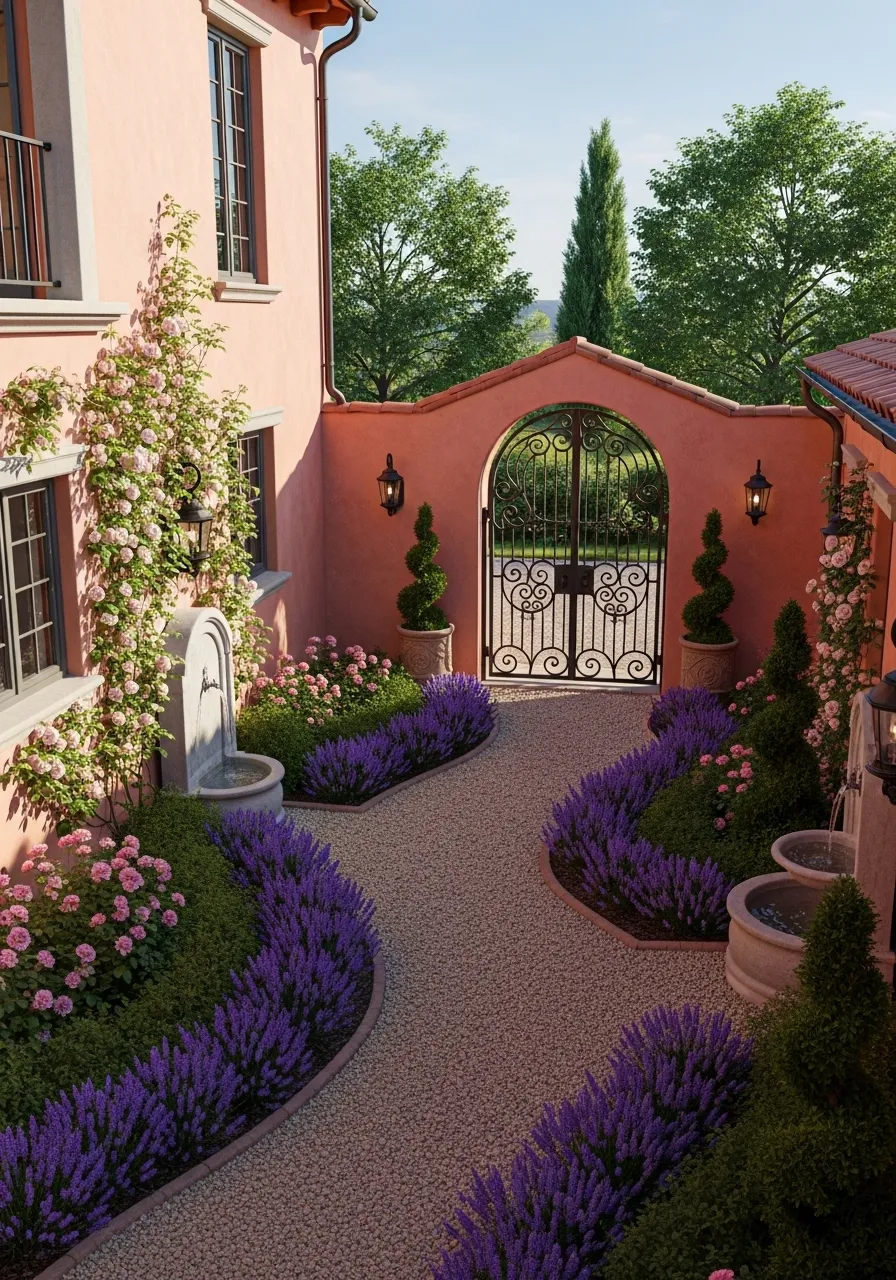 This front yard is pure European elegance. A soft peach-colored stucco exterior, adorned with climbing roses, creates the perfect backdrop for a dreamy Mediterranean-inspired garden. A gravel pathway, lined with fragrant lavender and delicate pink blooms, leads to an ornate wrought-iron gate. Classic stone fountains and neatly sculpted topiaries complete the look, bringing a timeless and sophisticated charm to the space.