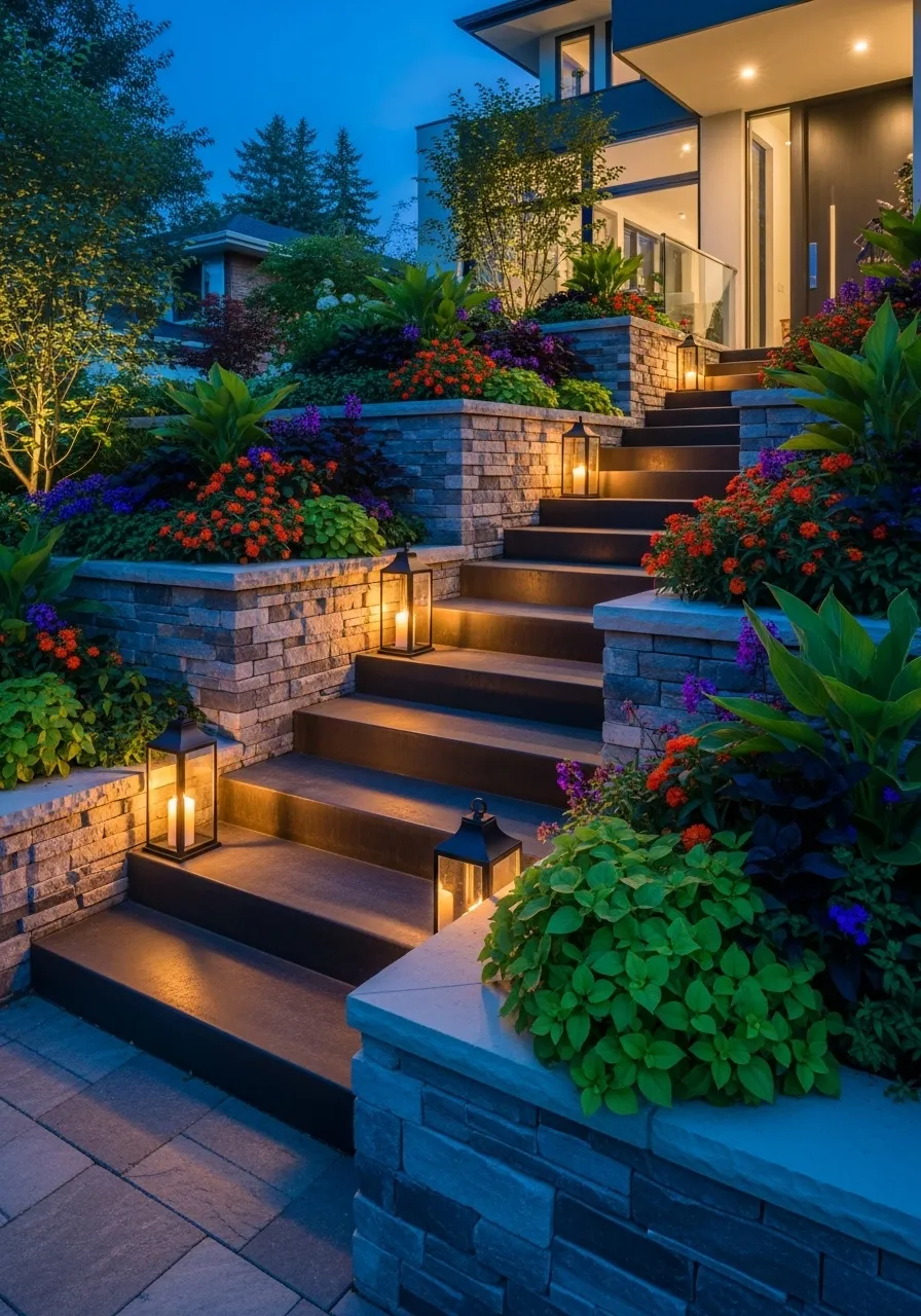 This front yard proves that contemporary design and lush landscaping can be a match made in heaven. A sleek staircase, framed by stacked stone planters, leads up to a bold black front door. Vibrant flowers in shades of orange, purple, and deep green spill over the edges, softening the clean lines of the architecture. Black lanterns glow warmly along the steps, adding a cozy and inviting touch to the modern aesthetic.