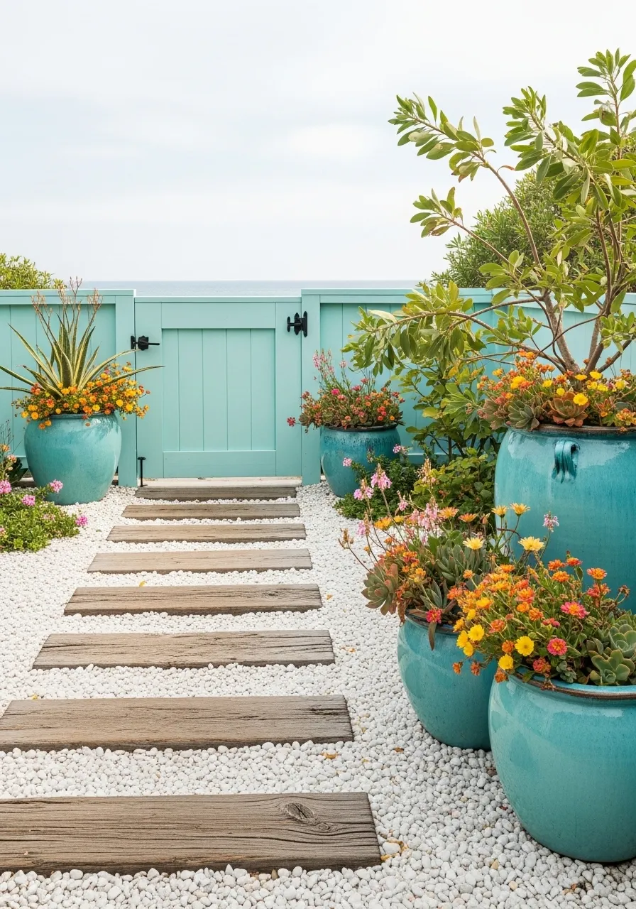 This front yard is the definition of laid-back coastal charm! A serene pathway of weathered wooden steppingstones winds through soft white gravel, creating a relaxed beachy feel. A row of dreamy seafoam blue ceramic pots, overflowing with succulents and desert blooms, lines the fence, adding the perfect pop of color. The light turquoise gate and cottage-style fencing tie everything together, making the entire space feel like a seaside retreat.