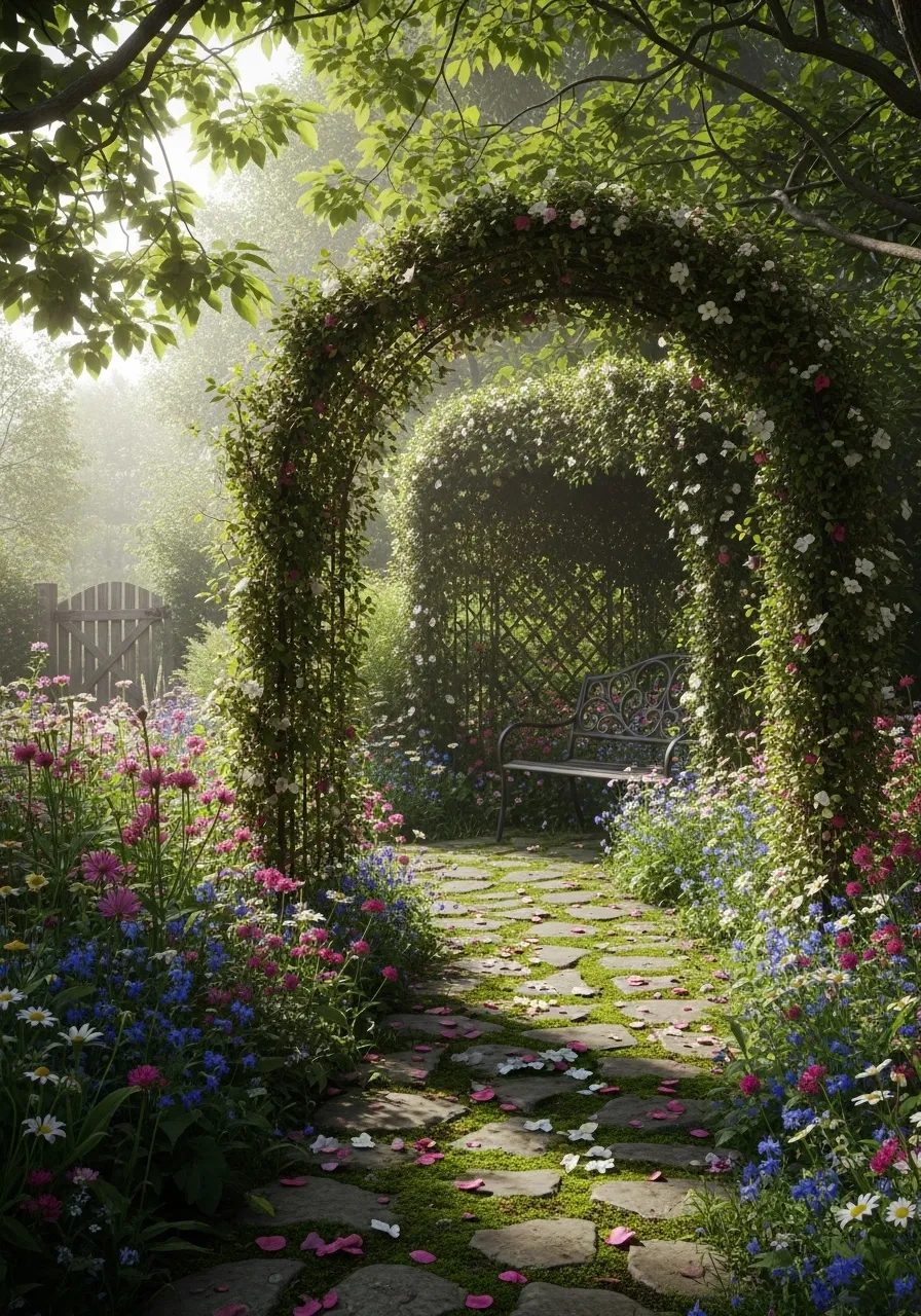 This front yard feels like stepping into a hidden oasis. A romantic stone pathway, softened by moss and scattered petals, leads through a lush archway of trailing vines. Wildflowers and fragrant blooms in soft pinks, blues, and whites spill over garden beds, creating a whimsical, overgrown charm. A classic wrought-iron bench tucked beneath the greenery makes for the perfect quiet retreat, while a charming wooden gate in the distance adds a sense of mystery and wonder.