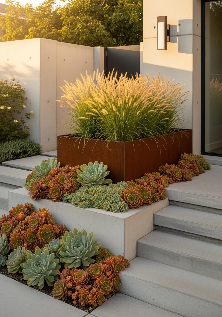 This front yard is a total showstopper with its bold, industrial-inspired design. A sleek rusted metal planter filled with golden ornamental grasses creates a striking contrast against the smooth concrete exterior. Succulents in warm, earthy tones add layers of texture, while the clean, geometric lines of the entrance steps bring a structured, modern touch. As the sunlight hits, the feathery grasses glow, giving the entire space a soft, golden warmth.