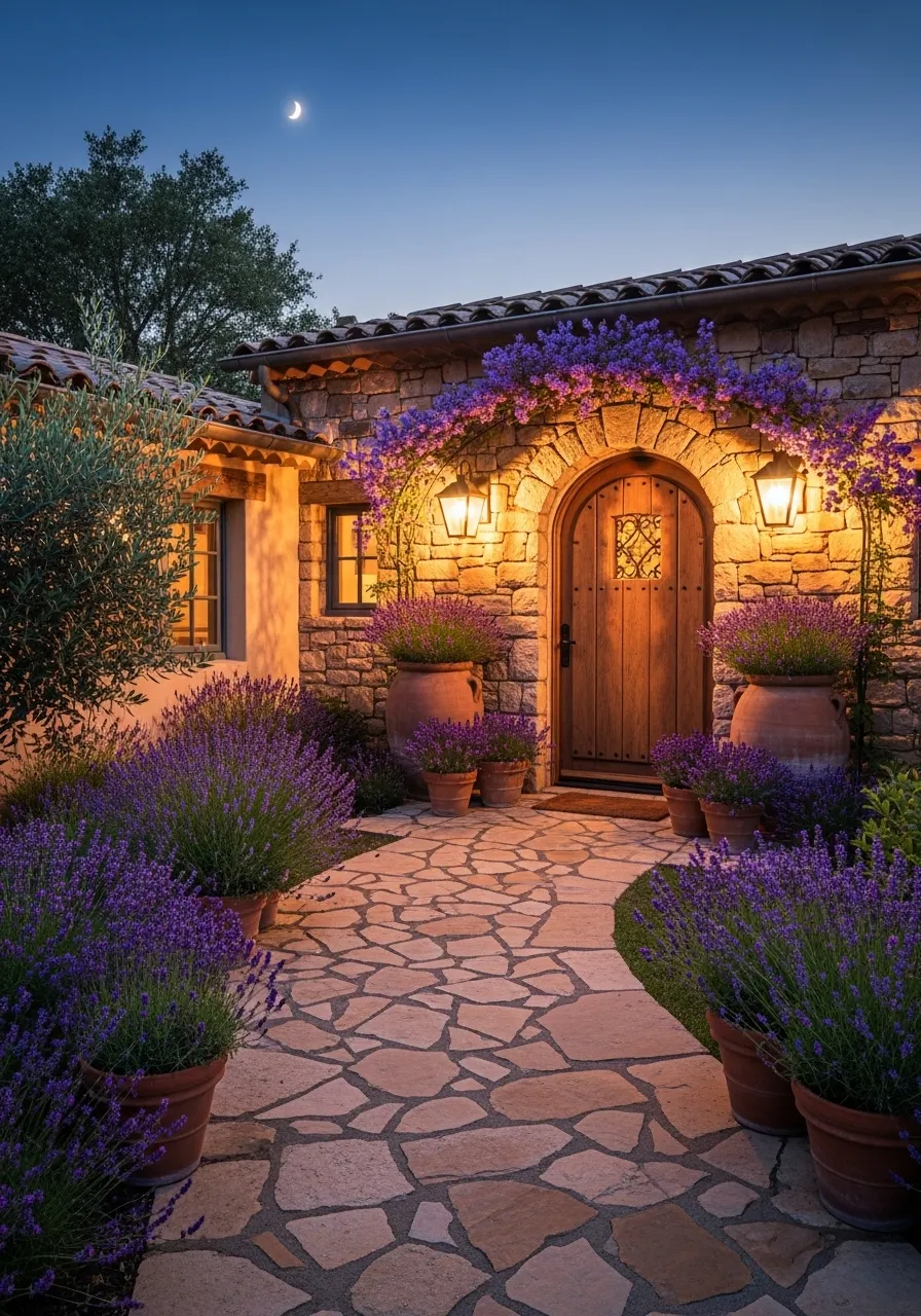 Rustic Mediterranean Entrance with Glowing Lavender Accents