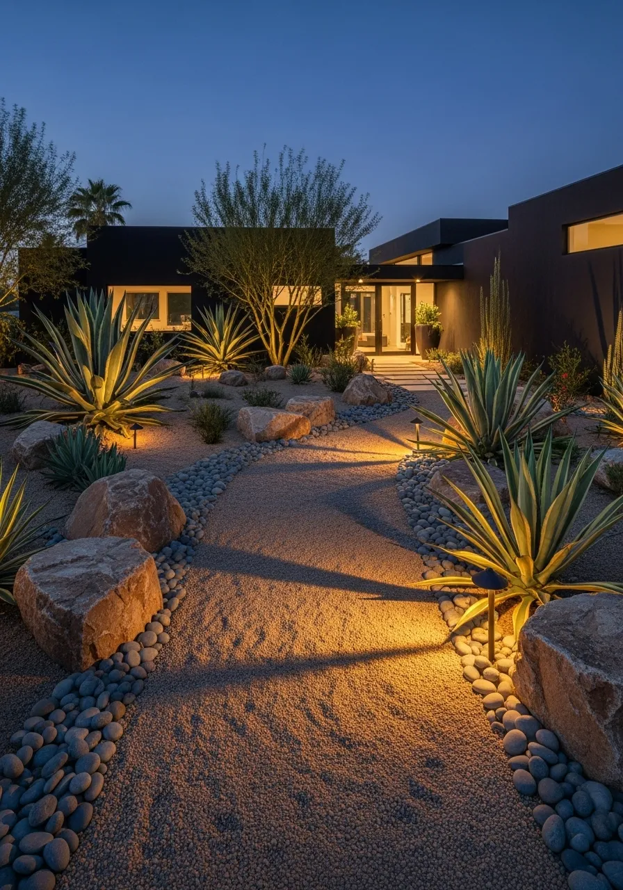 This front yard is desert landscaping done right! A winding gravel path, framed by natural boulders and smooth river stones, creates an effortlessly modern and organic flow toward a sleek, black contemporary home. Low-maintenance succulents and sculptural agave plants add striking contrast, while warm uplighting casts dramatic shadows over the rugged terrain. A subtle wooden accent softens the bold architecture, making the entire space feel welcoming yet undeniably stylish.