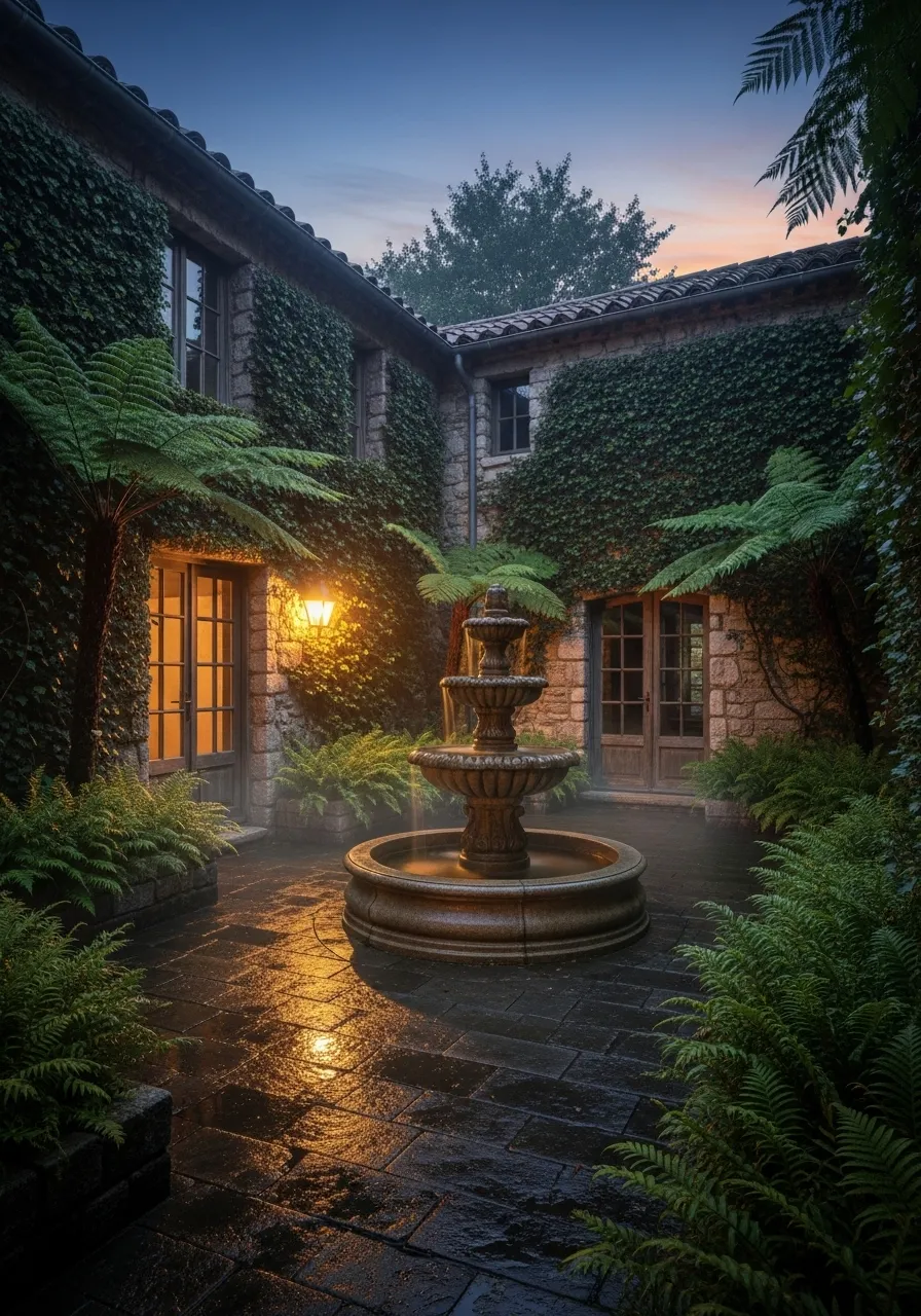 This front yard is pure storybook magic! A winding stone pathway, framed by lush ferns and ivy-covered walls, leads to a charming set of rustic French doors. At the heart of the space, a tiered stone fountain trickles softly, adding a serene ambiance. The rich texture of the aged stone, paired with warm golden lighting, creates a cozy, enchanted garden feel that looks straight out of a fairytale.