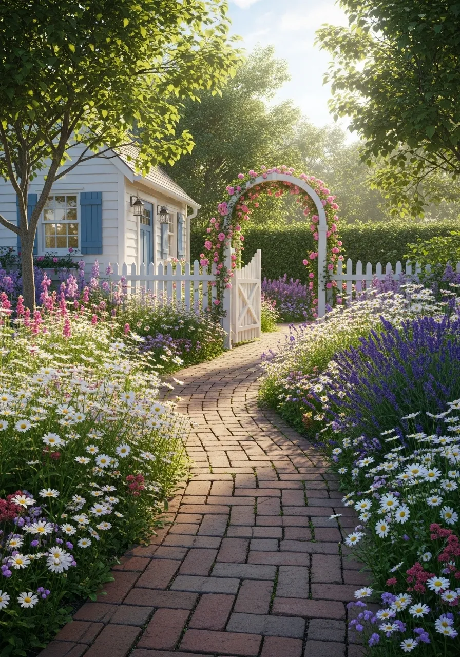 This front yard is straight out of a storybook! A picturesque brick pathway winds through a sea of colorful wildflowers, leading to the sweetest little white cottage. A delicate archway, covered in cascading roses, frames the entrance like something from a fairy tale. Soft pastel daisies, lavender, and climbing vines spill over a charming white picket fence, making this space feel effortlessly romantic and inviting.