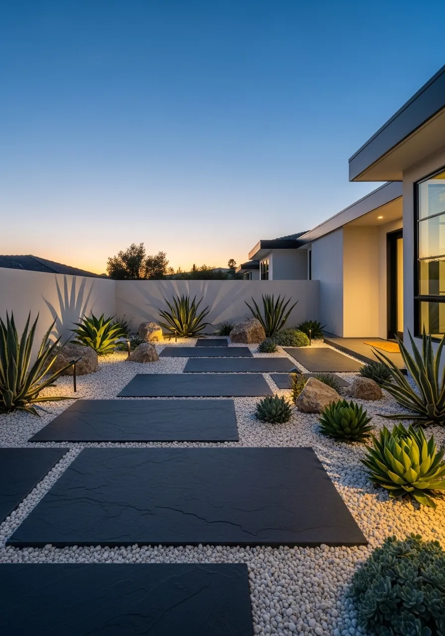This front yard proves that low-maintenance landscaping can still be jaw-droppingly gorgeous. A minimalist pathway of oversized dark slate pavers floats over a bed of crisp white gravel, leading to a sleek, contemporary home. Statement agave plants and sculptural succulents bring in texture and contrast, while warm ground lighting creates a cozy yet sophisticated glow at dusk.