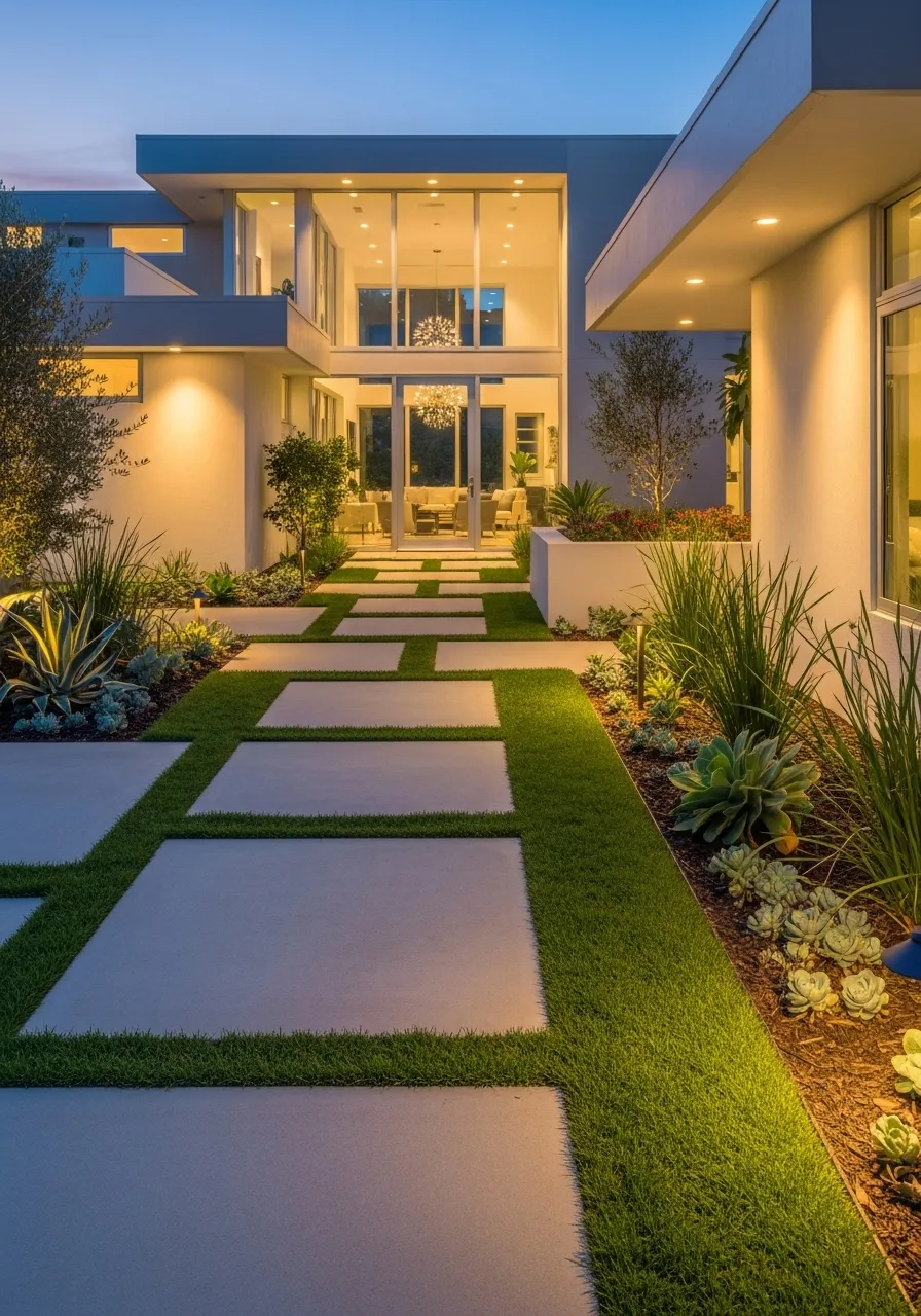 This front yard takes modern landscaping to a whole new level. A striking geometric pathway of large square pavers, outlined with lush green grass, creates a bold, structured entrance. The contemporary home’s clean lines and expansive glass windows add to the sleek aesthetic, while a mix of drought-tolerant plants and sculptural succulents soften the look. Warm outdoor lighting highlights the textures, making the entire space glow at dusk.