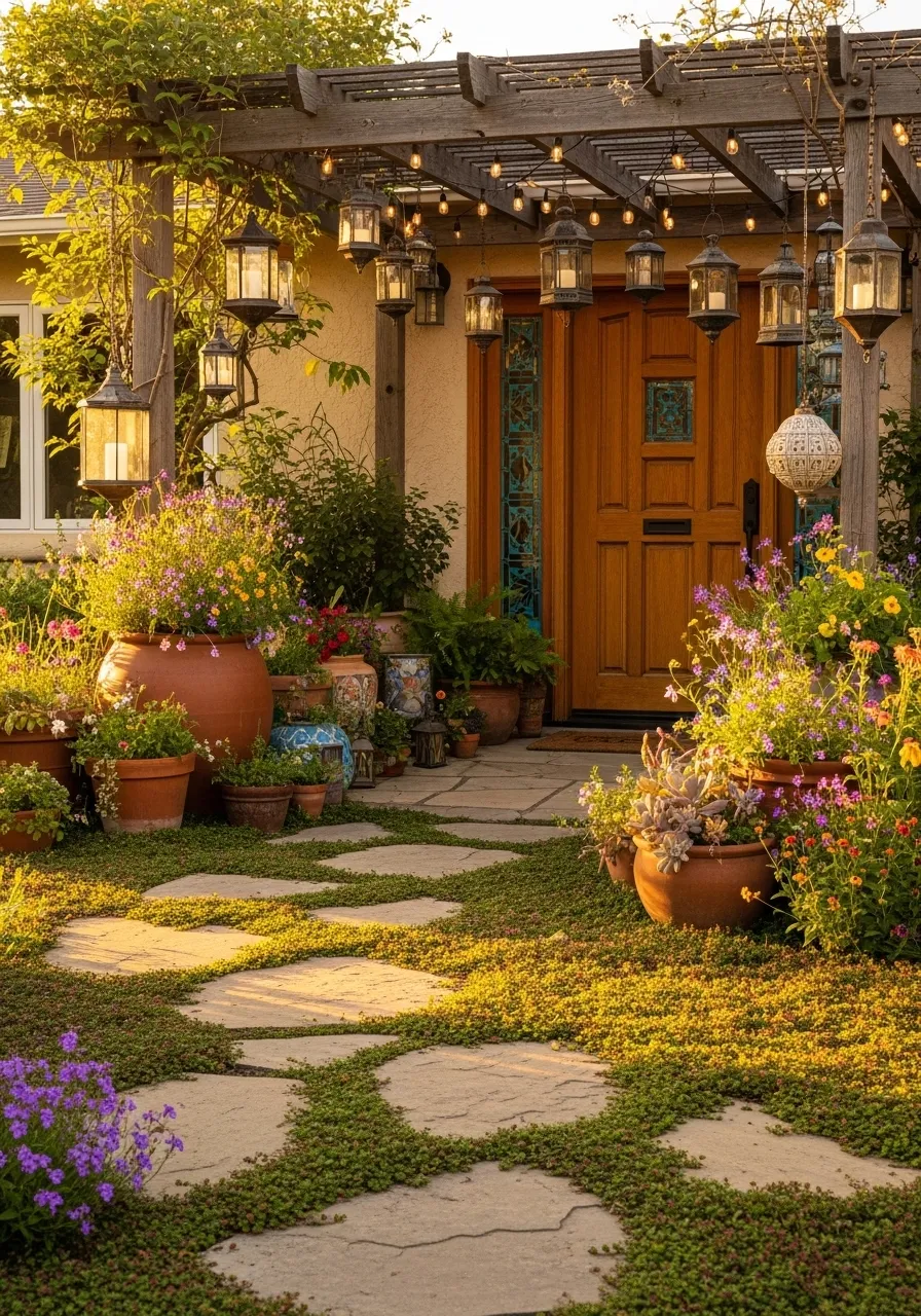 This front yard is an absolute boho dream! A flagstone pathway, dotted with creeping ground cover, leads to a warm wooden door framed by turquoise drapes. A rustic pergola, draped in string lights and hanging lanterns, creates a cozy, intimate entrance. Overflowing terracotta pots filled with wildflowers and succulents add a free-spirited, eclectic vibe. The whole space feels like a laid-back artist’s retreat with the perfect mix of color, texture, and personality.