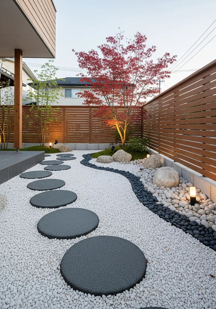 This front yard is pure Japanese tranquility. A series of round, floating steppingstones creates a soft, organic path across a bed of pristine white gravel. Carefully placed river rocks and a delicate maple tree bring balance and harmony to the minimalist design. The warm wooden slat fencing and subtle lighting add a cozy glow, making this space feel effortlessly peaceful and refined.