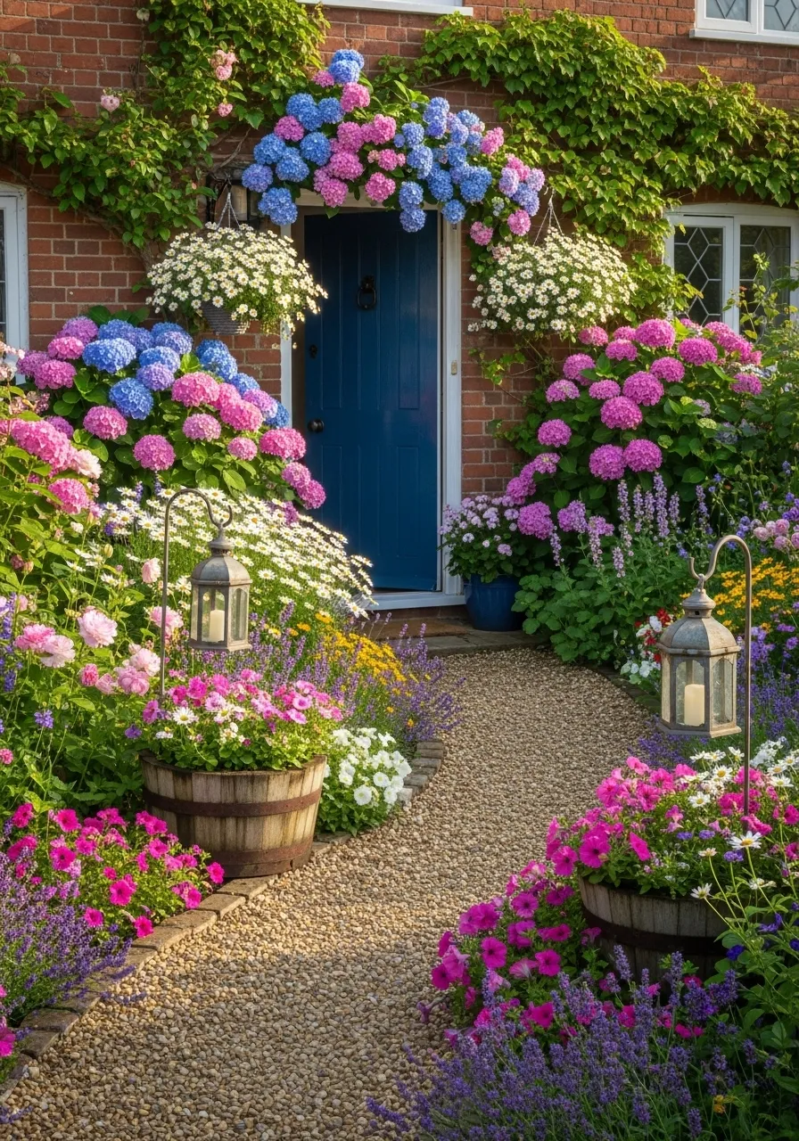 This front yard is pure cottagecore heaven! A deep blue door peeks out from behind a cascade of hydrangeas, daisies, and vibrant petunias, creating the most welcoming entrance. A gravel pathway adds a rustic touch, while wooden planters and vintage lanterns complete the cozy, old-world charm. The combination of brick, ivy, and overflowing flowerpots makes this space feel like a hidden countryside retreat.