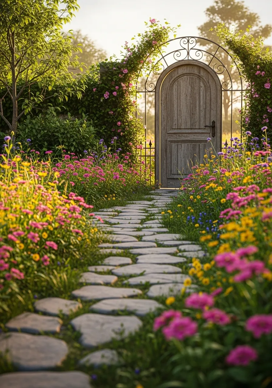 This front yard is what rustic garden dreams are made of! A winding stone pathway meanders through a sea of colorful wildflowers, leading to a fairytale-worthy brick cottage. Soft purple coneflowers, golden daisies, and delicate pink blossoms dance in the breeze, creating a natural, untamed beauty. The arched wooden door, framed by an iron gate and lush greenery, adds the perfect enchanted touch.