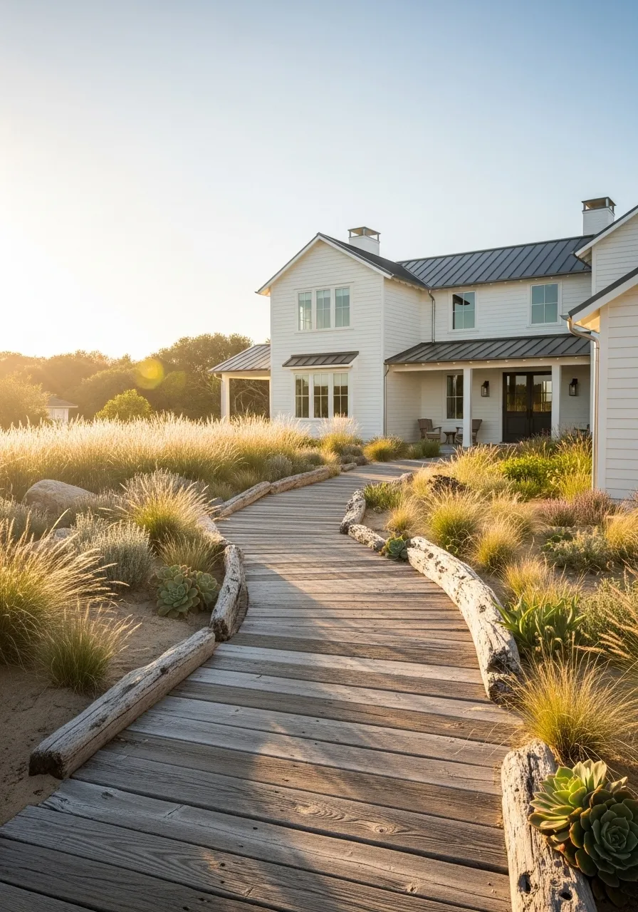 This front yard is the epitome of breezy coastal charm! A weathered wooden pathway, reminiscent of sun-bleached driftwood, winds through a relaxed landscape filled with ornamental grasses, succulents, and soft sandy textures. The modern farmhouse exterior, with its crisp white siding and metal roof, perfectly complements the natural beauty of the space. Sunlight bathes the entire setting in a golden glow, making it feel like a peaceful seaside retreat.