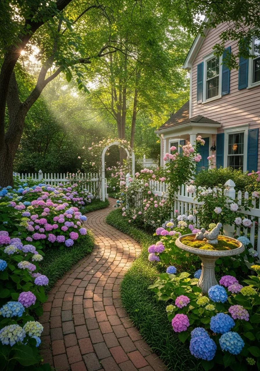 This front yard looks like it came straight out of a storybook! A winding brick pathway, lined with dreamy pastel hydrangeas, leads to the most adorable home with soft pink siding and sky-blue shutters. A delicate white picket fence frames the space, while a vintage birdbath adds an extra dose of fairytale charm. Sunlight filters through the trees, casting a golden glow that makes the whole scene feel like pure magic.