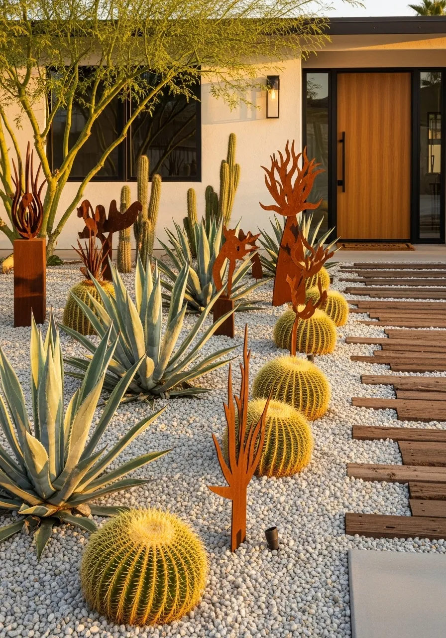 This front yard is desert landscaping at its finest. A bed of pristine white gravel creates a serene foundation for a mix of towering agave plants, golden barrel cacti, and sculptural succulents. A rustic wooden walkway leads to a gorgeous warm-toned front door, framed by sleek black trim. The organic curves of rusted metal art pieces add a modern, artistic edge, while the soft desert sunlight enhances the earthy, natural tones of the space.