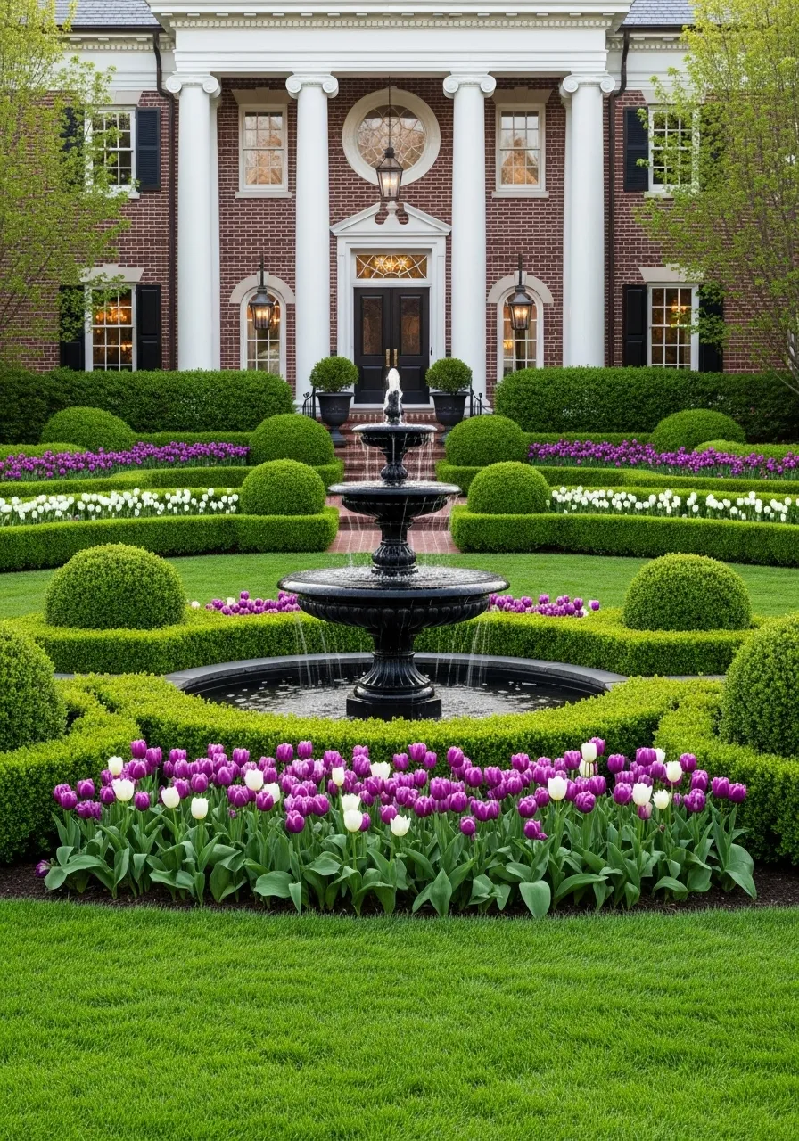 This front yard is straight out of a Southern estate dream. Perfectly trimmed boxwood hedges form a stunning geometric garden, filled with waves of purple and white tulips. A classic black-tiered fountain stands at the center, adding a touch of European elegance. The stately brick home, with its grand white columns and warm glowing lanterns, completes the look of timeless sophistication.