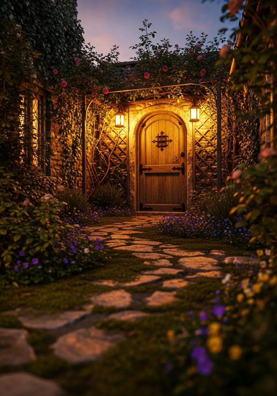 This front yard feels like something out of a fairytale. A winding stone pathway, softened by moss and tiny wildflowers, leads to a weathered wooden door with charming iron details. Overhead, a rustic wooden trellis draped in climbing vines and delicate blooms adds a dreamy touch. Softly glowing lanterns cast a warm, golden light, making the entire space feel like a hidden sanctuary.