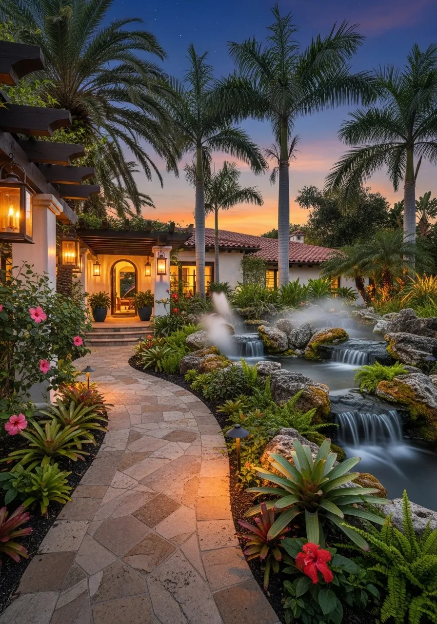 Honestly, this is the kind of front yard that makes you want to ditch your shoes and stroll barefoot through the misty pathways. The mix of tropical greenery, warm stone textures, and the sound of trickling water is just everything! If paradise had a front door, I’m pretty sure this would be it.
