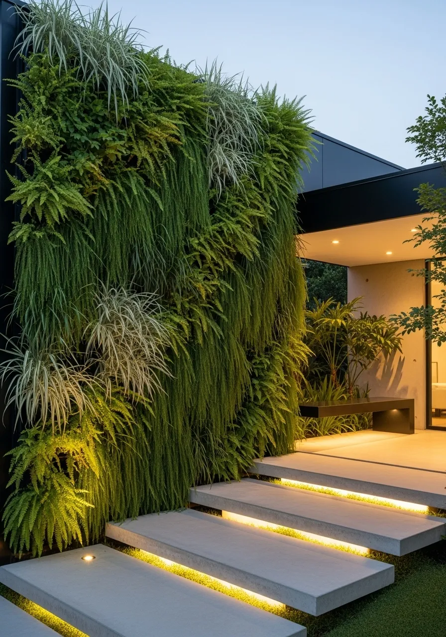 This ultra-modern front yard proves that even the smallest spaces can be packed with personality. A stunning vertical garden, overflowing with cascading ferns and grasses, adds a lush, jungle-like vibe to the sleek black exterior. Floating concrete steps lead to a minimalist bench tucked beneath the greenery, creating the perfect balance between modern structure and organic beauty. Warm accent lighting highlights the textures, making this entrance feel effortlessly chic.