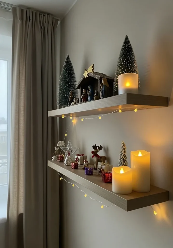 These floating shelves bring the Christmas spirit to life without crowding the room. A small nativity scene, tiny trees, flickering candles, and miniature wrapped gifts create a layered yet airy setup. The twinkle lights tucked underneath add just the right touch of warmth, making this simple display feel cozy and magical at the same time.