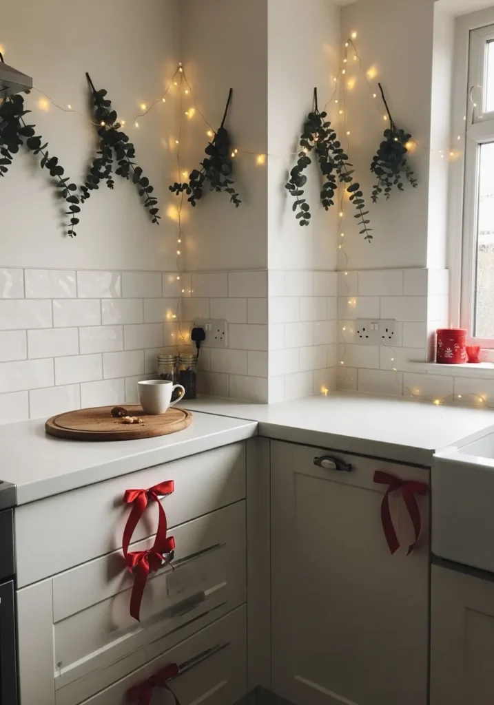 This tiny kitchen feels merry and bright thanks to a few simple touches—sprigs of eucalyptus, twinkling fairy lights, and red ribbons tied neatly on the drawers. The white tile and natural light keep everything open and airy, even with the festive touches.