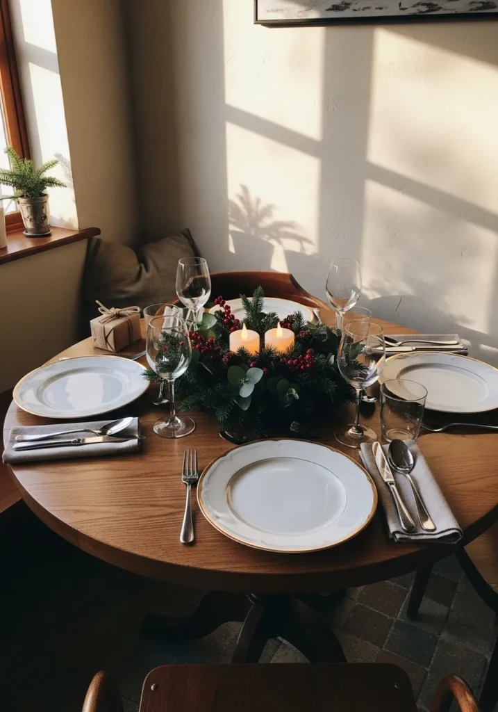A round wooden table is dressed for the season with a simple candle centerpiece surrounded by greenery and red berries. The sunlight streaming in makes the whole setup glow naturally. It’s intimate, elegant, and perfect for small-space dining.