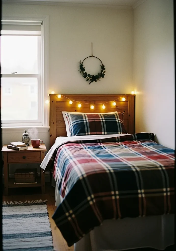 This small bedroom feels instantly festive with a strand of golden fairy lights across the headboard and a delicate wreath above the bed. The plaid bedding adds a cozy, classic touch that feels right at home for the holidays.