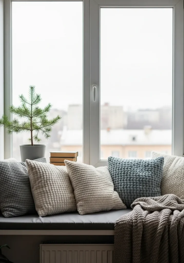 A tiny pine tree in a simple gray pot brings a soft touch of Christmas cheer to this cozy window seat. The mix of chunky knit pillows and a warm throw blanket makes the space feel like a personal retreat on a snowy day. The natural light flooding in adds to the open and airy mood.