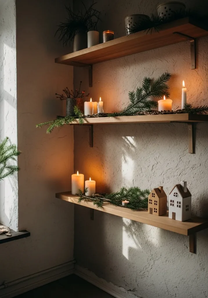 Wooden shelves come to life with soft candlelight, evergreen sprigs, and tiny wooden house decorations. The natural materials and simple styling keep things cozy while leaving plenty of breathing room, making the space feel warm but not cluttered.
