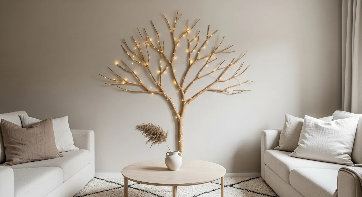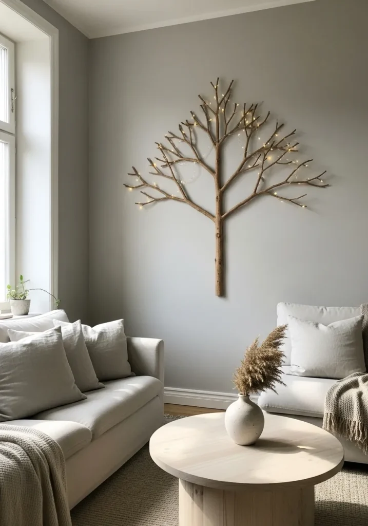 This creative wall display turns branches into a tree-shaped feature with delicate string lights. It’s a brilliant idea for small homes where floor space is limited but holiday spirit runs high. The neutral colors and soft light make it blend perfectly with modern interiors.