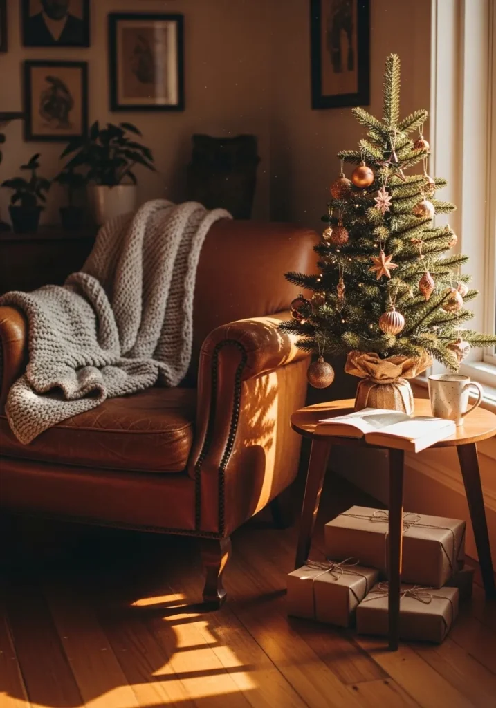 A small decorated tree stands beside a leather armchair, surrounded by sunlight and wrapped gifts. The soft knit blanket draped over the chair adds texture and warmth, creating a cozy corner that feels like the heart of the home.
