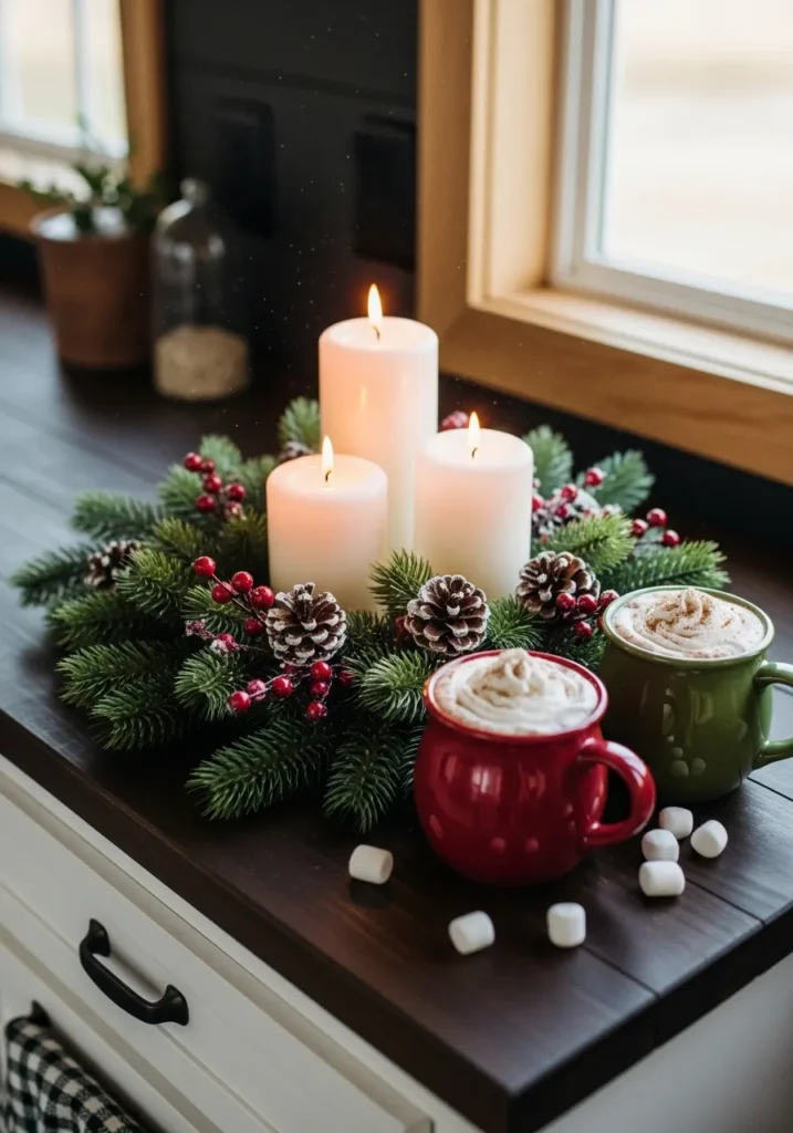 This charming little scene brings all the Christmas joy to your kitchen counter. A candle centerpiece made of evergreens, pinecones, and berries pairs beautifully with mugs of hot cocoa topped with whipped cream. It’s the kind of setup that feels straight out of a cozy Christmas morning.